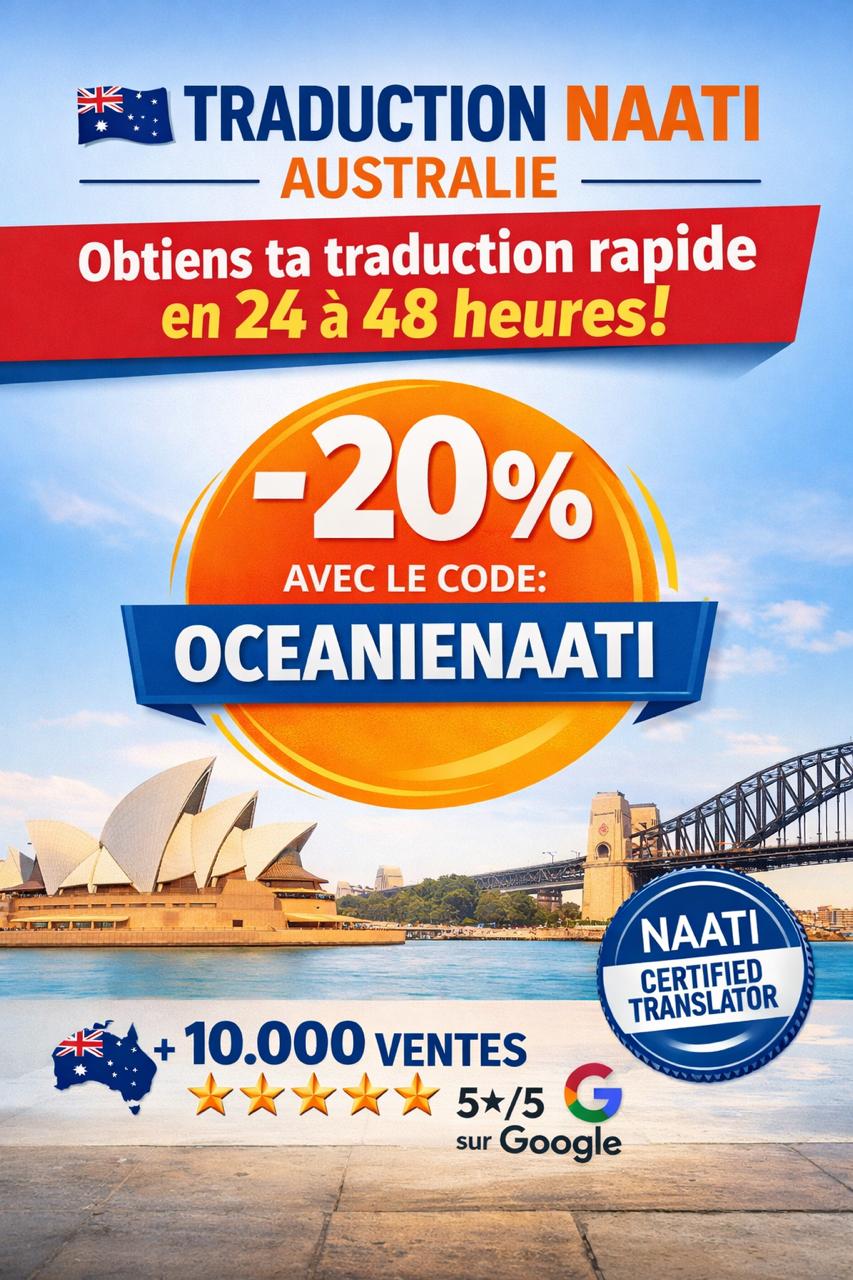 📌 Le plus simple (et le plus rapide) : commander une traduction NAATI prête à imprimer, puis mettre OCEANIENAATI au moment du paiement (ça fait -8€).